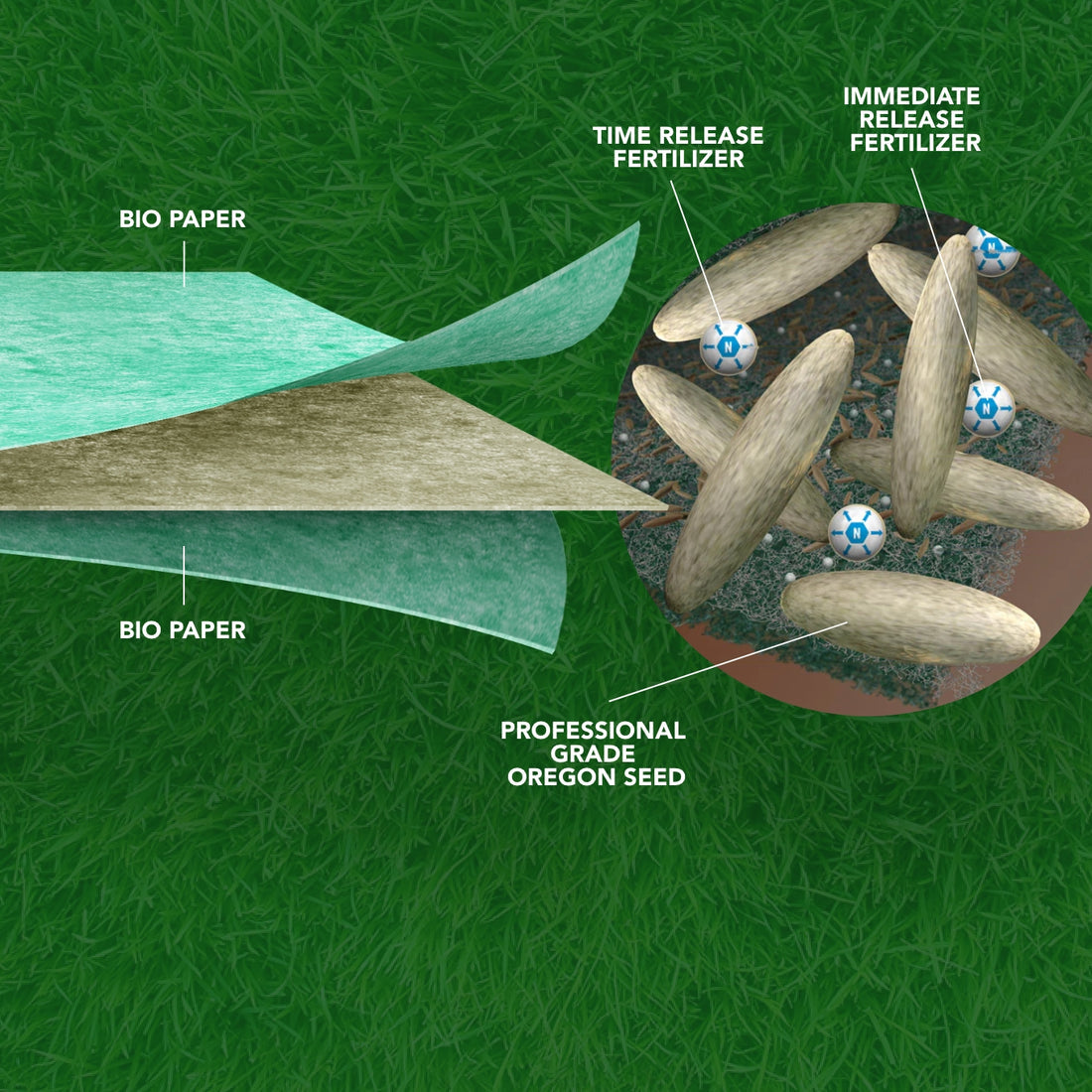 Patent-pending and super absorbent. Once rolled out and watered, it sticks to the ground. Each seed is then surrounded by fertilizer and held in place between two bio fabric layers, holding 6 times their weight in water. Simply roll, water and watch it grow!